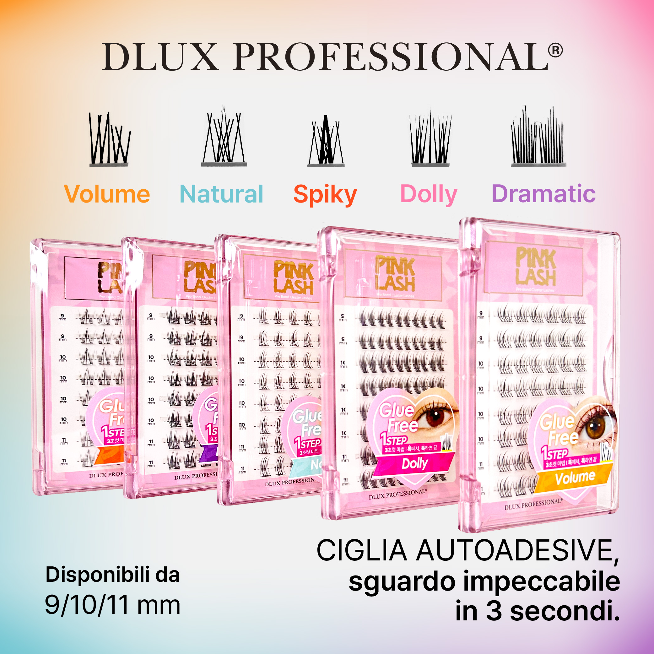 Le PINK LASHES di DLux Professional sono le ciglia autoadesive pronte all’uso che trasformano il tuo sguardo in pochi secondi. Con lunghezze naturali tra 9 e 11 mm, si adattano perfettamente a ogni forma d’occhio, regalando volume, definizione e un effetto sorprendente senza compromessi.